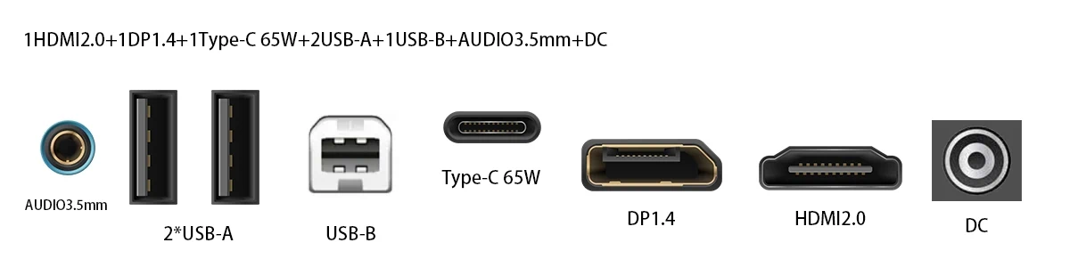 אות קלט: 1 HDMI 2.0 + 1 DP 1.4 + 1 Type-C 65W + 2 USB-A + 1 USB-B + 3.5 מ"מ אודיו + DC